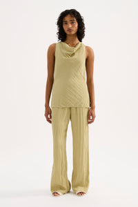 The Alia Pant is made from a viscose blend fabric which is lightweight and has a soft, textured hand feel. The silhouette is a relaxed wide leg, full length pant. Features include an elasticated waistband, side seam pockets and slits at hem.