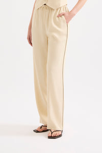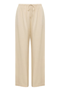 The Garcia Pant is made from a viscose blend fabrication which has a dry hand feel and a slub linen yarn throughout giving a light speckled appearance. The silhouette is relaxed with a wide full length leg. Features include an elasticated waistband with an external draw cord and contrast piping down side seams.