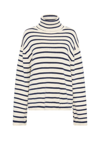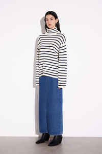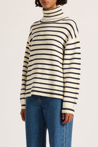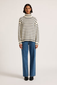 The Kai Turtleneck is made from a cotton blend yarn with a soft hand feel. The silhouette is relaxed with a dropped shoulder, and length finishing below the hips. Features include fold over turtleneck, ribbed collar, cuff and hem.