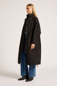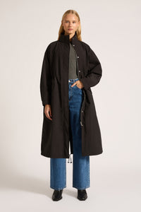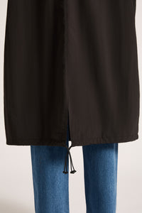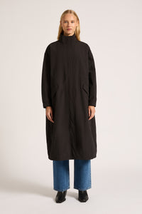 The Logan Anorak is made from a lightweight recycled nylon which has a crisp hand feel and is water resistant. The silhouette is relaxed with long sleeves and length finishing above the ankles. Features include zipper and snap opening, functional internal draw cord at waist and hem, side front pockets and elasticated cuff.
