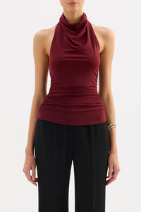 The Abru Halter Top is made from a premium stretch jersey fabrication. The silhouette is form fitting, with length finishing at the hip. Features include a high cowl halter neck with button fastening at back neck and a low back.