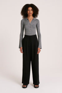 The Abyss Knit Top is made in a  soft cotton blend knit. The silhouette is fitted to the body with length finishing on the hip. Features include full length sleeves with a flared sleeve cuff, ribbed placket and shell buttons.