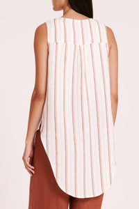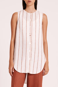 The Aisha Linen Sleeveless Shirt is made from our premium linen fabrication in our exclusive Amber Stripe. The silhouette is oversized with a curved hem finishing below the hips. Features include contrast coloured button detail.