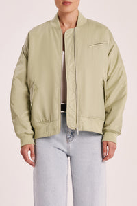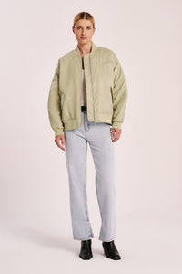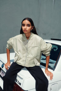 The Alcott Bomber is made from a lightweight recycled nylon and has lightweight padding. The silhouette is oversized with length finishing above the hips. Features include zipper opening at centre front, gathered detail on back sleeve and ribbed cuff and hem. The jacket is fully lined in contrast colour with diamond shape quilting.