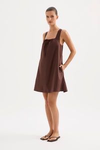 The Alexis Mini Dress is made from a cotton poplin which has be washed for a smooth, crisp hand feel. The silhouette is feminine and relaxed with a square, gathered neckline and soft billowing skirt finishing mini in length. Features include tie at front and side seam pockets.