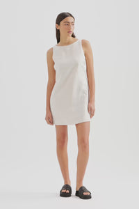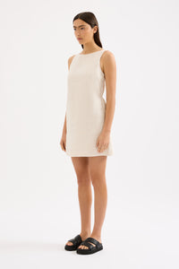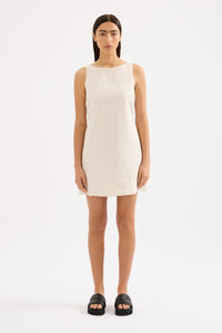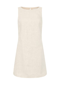 The Aliya Linen Mini Dress is made from 100% Linen which has been washed for a soft, breathable hand feel. The silhouette is feminine with elastic and tie at the back waist and a mini skirt. Features include high neckline and button keyhole opening.