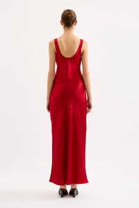 The Allegra Slip Dress is made from a premium satin featuring a luminous, gloss finish and subtle crinkle texture. Cut on the bias, this silhouette drapes over the body softly and finishes above the ankles. Features include a low scoop neckline, waist tie and side slit.