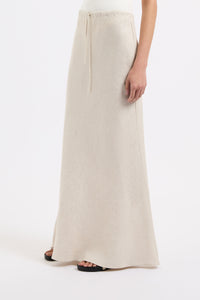 The Amani Linen Skirt in natural is made from a premium linen which has been washed for a smooth, soft hand feel. Cut on the bias, this silhouette finishes just above the ankles. Features include encased elasticated waistband with a self cut draw string at centre front.