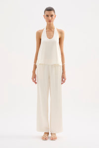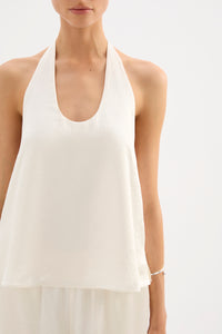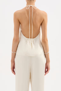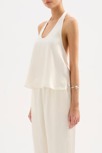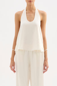 The Ana Halter Top is made from a premium crushed satin featuring a luminous, gloss finish and subtle crinkle texture. The silhouette is a halter neck with a low back. Features include low scooped neckline with thin neck ties and elastic, gathered detail at back.