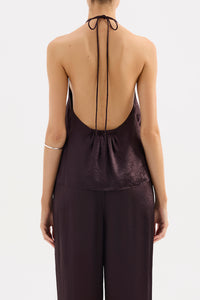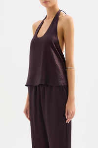 The Ana Halter Top is made from a premium crushed satin featuring a luminous, gloss finish and subtle crinkle texture. The silhouette is a halter neck with a low back. Features include low scooped neckline with thin neck ties and elastic, gathered detail at back.