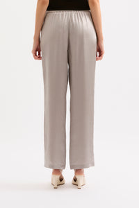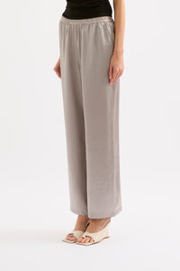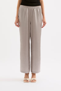 The Ana Pant is made from a premium crushed satin featuring a luminous, gloss finish and subtle crinkle texture. The silhouette is a wide leg, full length pant. Features include an elasticated waistband and side seam pockets.