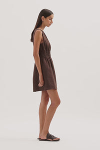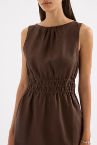 The Andri Linen Mini Dress is made from premium linen fabrication with a breathable, soft hand feel. This mini dress features a high boat neckline, shirred elastic waist, side seam pockets, invisible zipper at back and gathers at front neck.