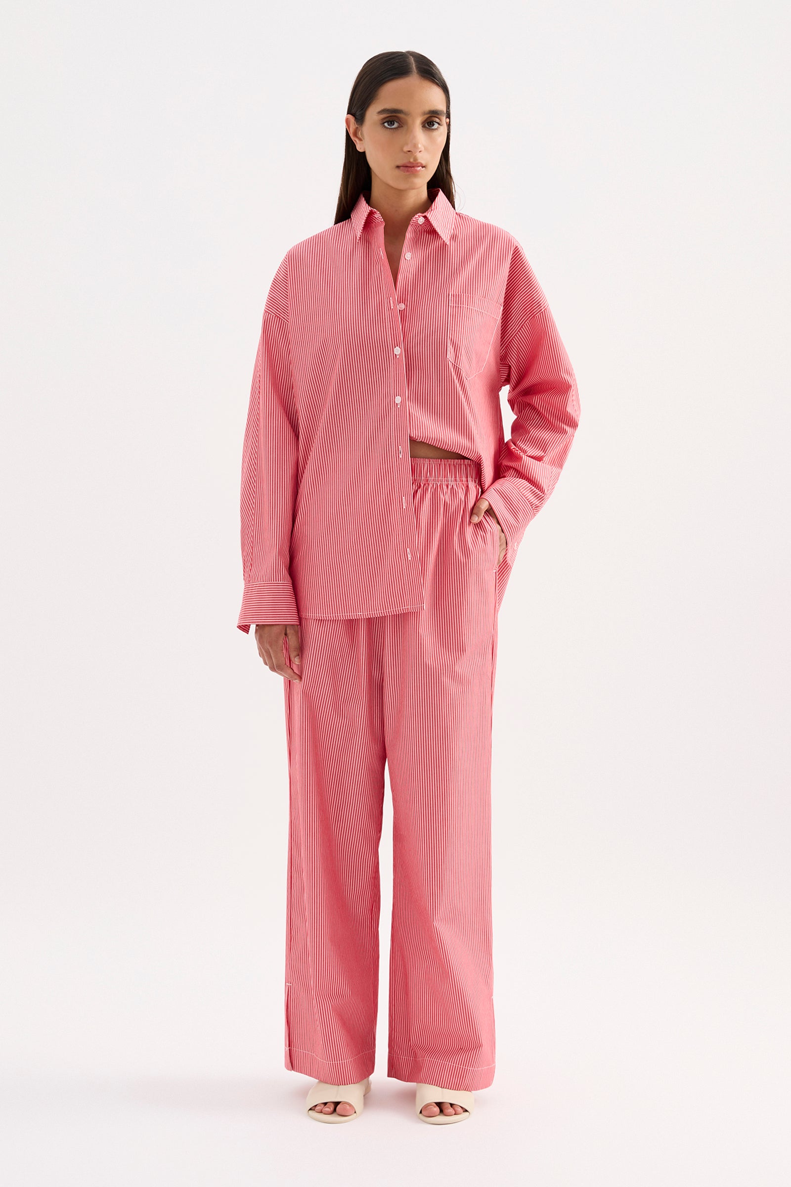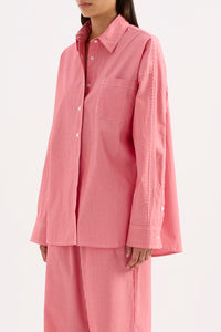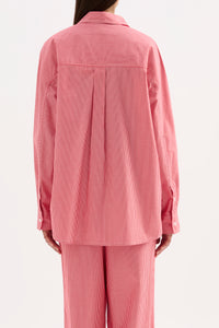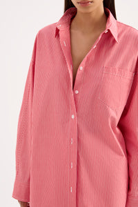 The Anouk Stripe Shirt is made from an organic cotton poplin which has be washed for a smooth, crisp hand feel in a seasonal red mini stripe. The silhouette is oversized throughout with length finishing below the hips. Features include classic shirting details with front patch pocket and Nude Lucy branded buttons.