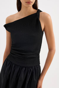 The Apollo Top is made from a stretch bubble texture fabrication that has a soft, dry hand feel. The silhouette is a flattering close fit and finishes above the hips. Features include an asymmetric neckline, with a twist straps and soft gathers through the waist. This top is fully lined.