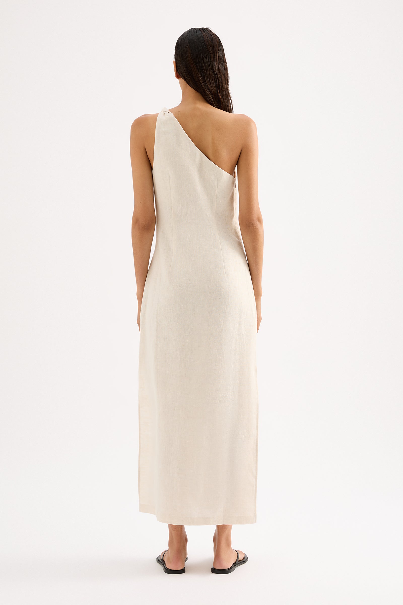 The Avery Linen Midi Dress is made from a premium linen which has been washed for a smooth, soft hand feel. The silhouette is feminine with one thick shoulder strap, fitted waist and midi length skirt finishing above the ankle. Features include shoulder strap twist detail, gripper tape on inside neckline, side split and invisible zipper.