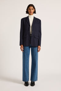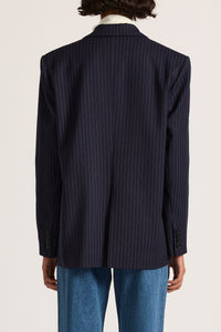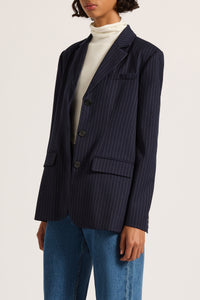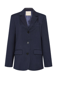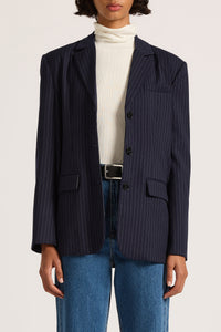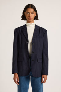 The Bailey Pinstripe Blazer is made from a classic suiting fabrication with a smooth hand feel. The silhouette is a structured single breasted shape with a sloped shoulder, relaxed to slim fit body & full length sleeve. Features include traditional tailoring detailing throughout, tailored vents at sleeves and back of body and Nude Lucy branded buttons.
