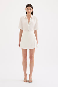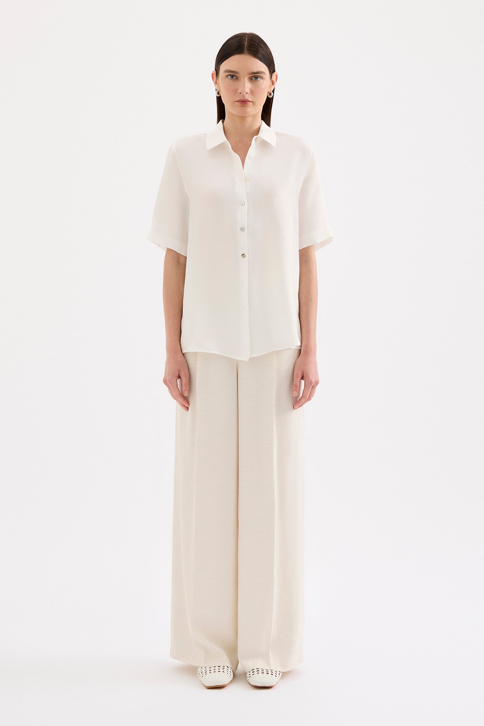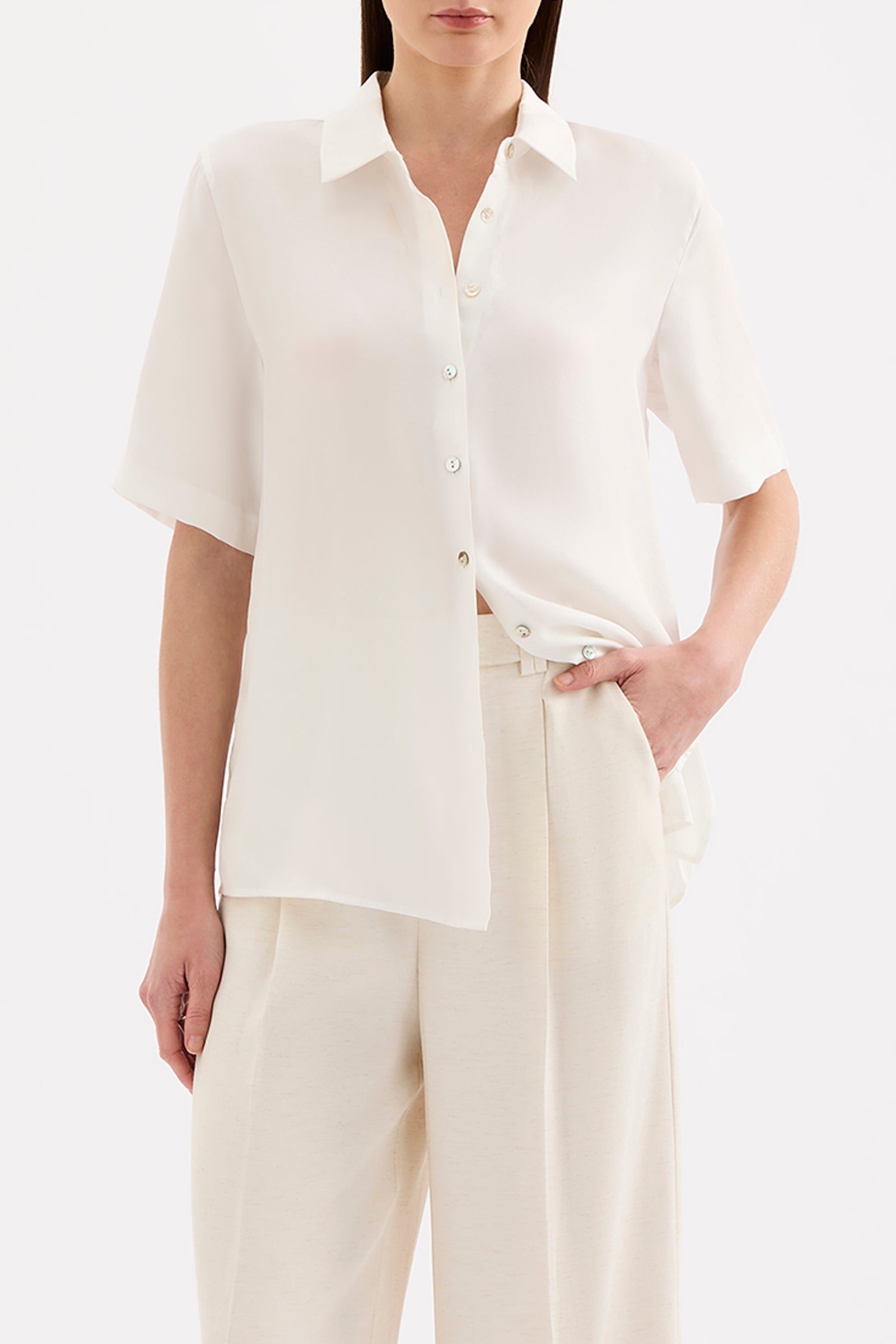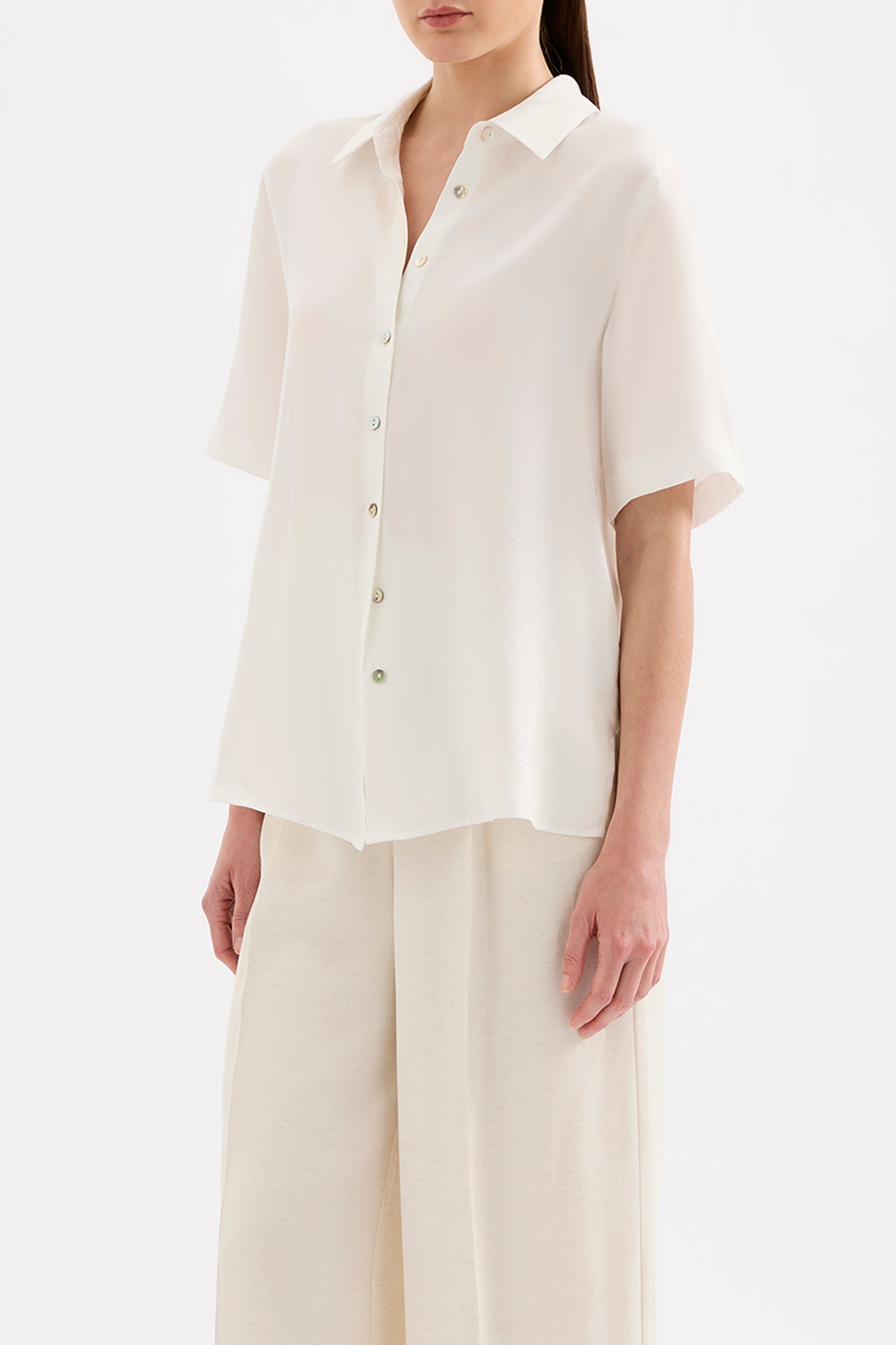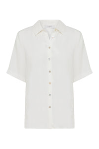 The Beckett Shirt is made with a viscose blend fabrication. This slightly sheer oversized shirt is lightweight with a smooth hand feel and features a traditional shirt collar, front button opening and shell buttons.