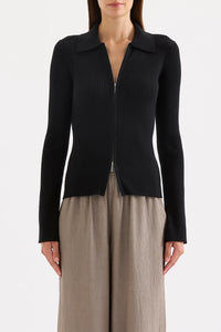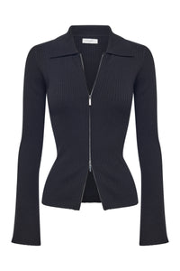 The Betina Zip Front Knit is made from a cotton blend yarn which has a ribbed, soft hand feel. The silhouette is fitted to the body with long, flared sleeves and length finishing above the hips. Features include knitted collar and a branded double ended zipper at centre front.