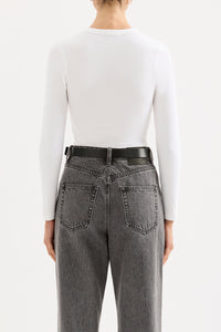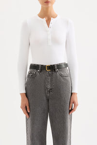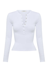 The Binx Long Sleeve Top is made in an organic cotton which has a high stretch and ribbed effect. The silhouette is a flattering close fit with a crew neckline and length finishing at the hips. Features include long fitted sleeves, snap button closure. This can be tucked in or worn over midrise bottoms.