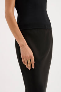 The Brielle Ring is a thin silhouette stacked ring with an organic wave shape. It is made from brass with 18 karat gold plating and has a polished, smooth finish. This ring is adjustable.