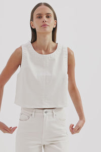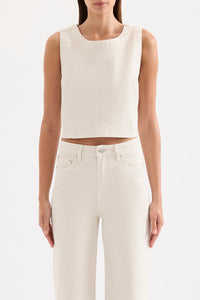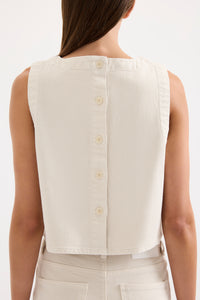 The Cali Denim Top is made from a stretch organic cotton denim that has been washed to a stone wash Dune. The silhouette is a clean, casual cropped fit which finishes on the waist. Features include a round, crew neckline and button opening at centre back.
