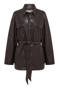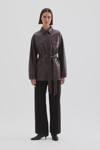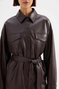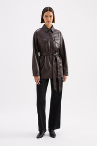 The Camille Vegan Leather Overshirt is designed from a premium lightweight vegan leather perfect for elevating your capsule. This overshirt has a smooth hand feel with a glossy texture and is a relaxed fit. Features include invisible snaps opening, waist tie to cinch in, chest pockets, front and back yoke and cuffed sleeves.
