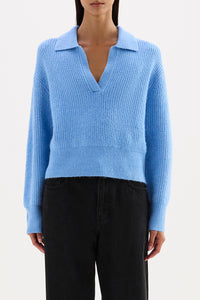 The Coleen Rugby Knit is crafted from a premium fluffy yarn, designed to be worn on its own or as a layering piece. This knit sweater has a relaxed silhouette and sits above the hips. Features include a knitted rugby collar and rib knit cuffs.