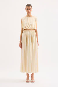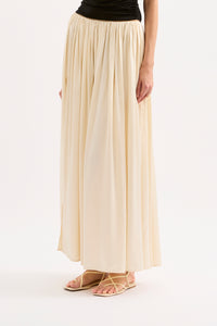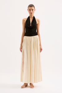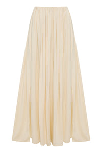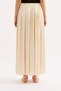 The Cosette Maxi Skirt is made from a fluid, premium satin with a luxurious hand feel. The silhouette is A line with a full, gathered maxi skirt. This skirt has an internal elastic waistband and double splits at front.