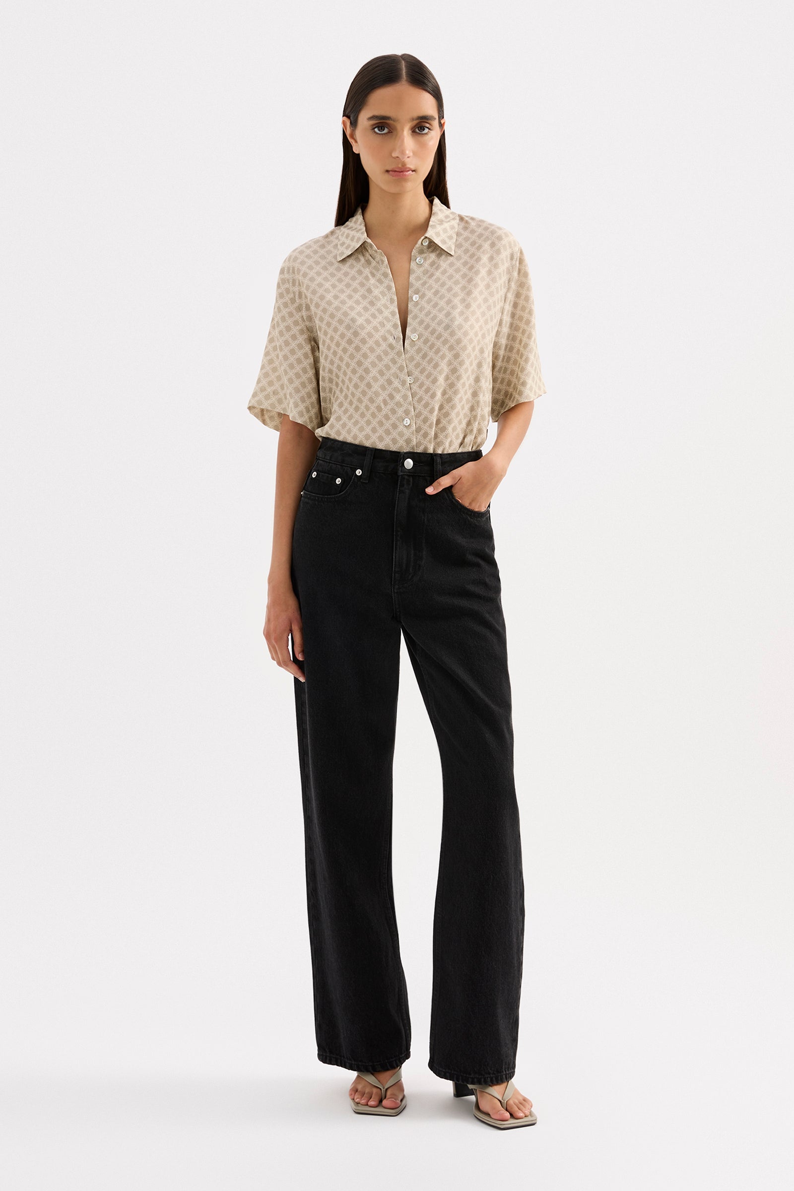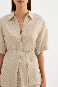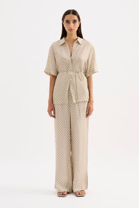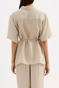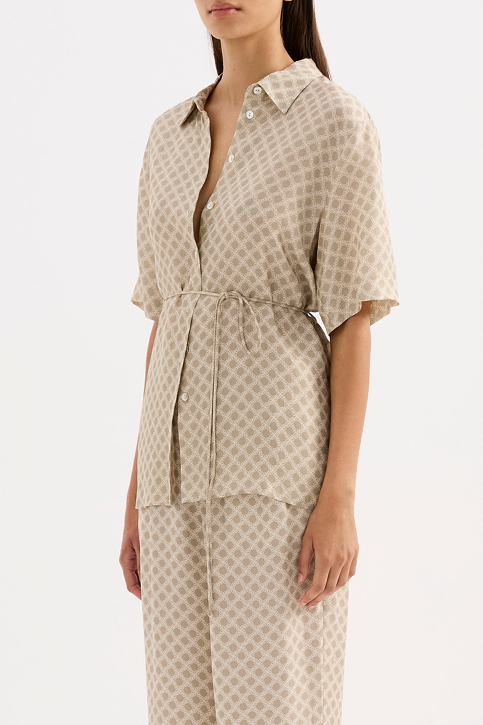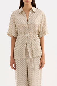 The Cosmos Cupro Shirt is made in our signature cupro fabrication in our exclusive Cosmos print. The silhouette is an oversized fit, with length finishing at the hip. Features include classic shirting details, back yoke, thin rouleau waist tie and shell buttons.