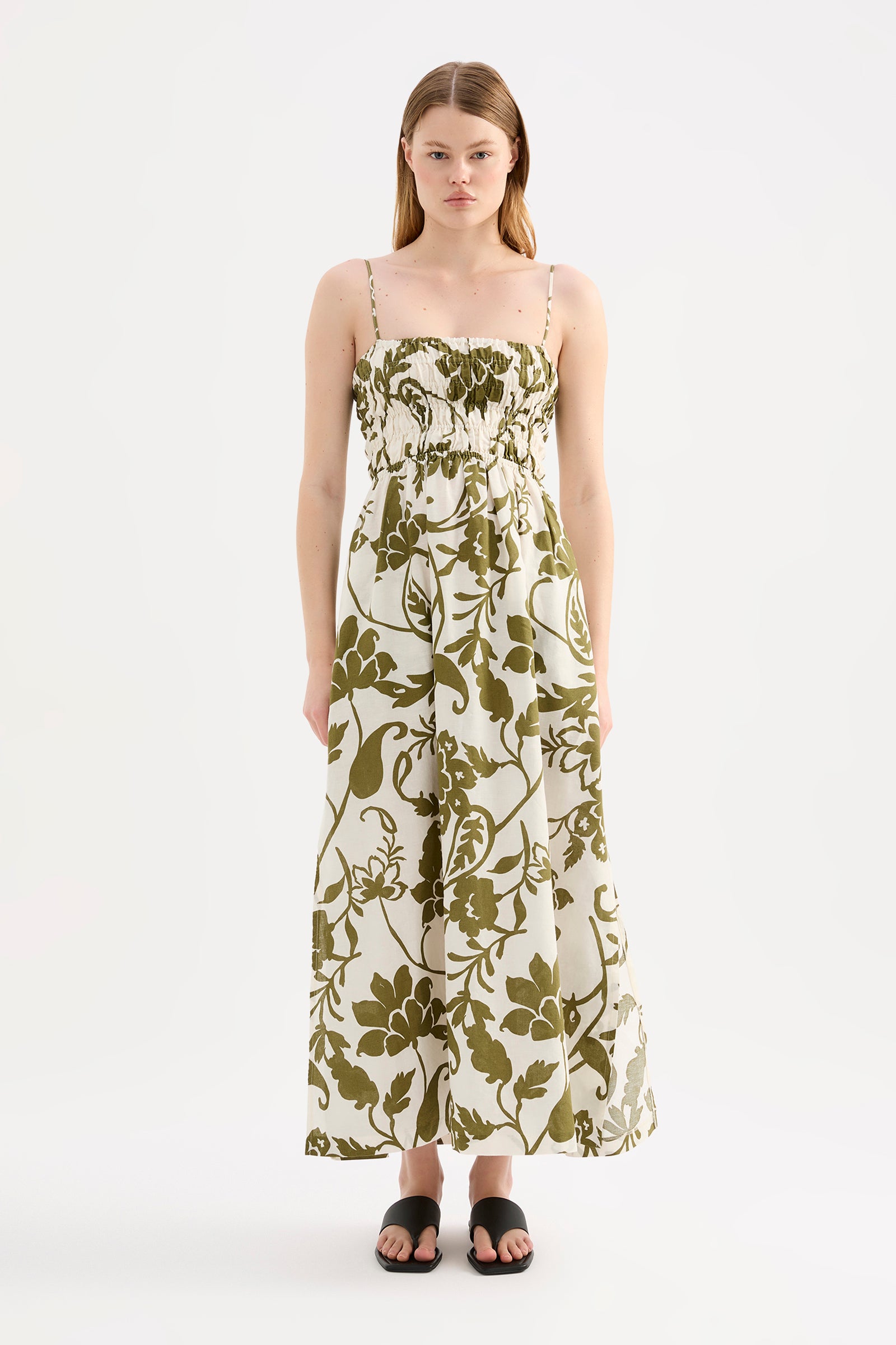 The Dahlia Maxi Dress is made from a linen blend fabrication in our exclusive Dahlia print. The silhouette is fitted to the waist with an a line skirt finishing just above the ankle. Features include a shirred bodice with a square neckline, adjustable straps and side seam pockets.
