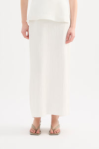 The Danika Maxi Skirt is made from a crinkle textured fabric which has a dry, lightweight hand feel. The silhouette is high waisted, straight fit with length finishing at the ankles. Features include a centre back vent and zipper opening.