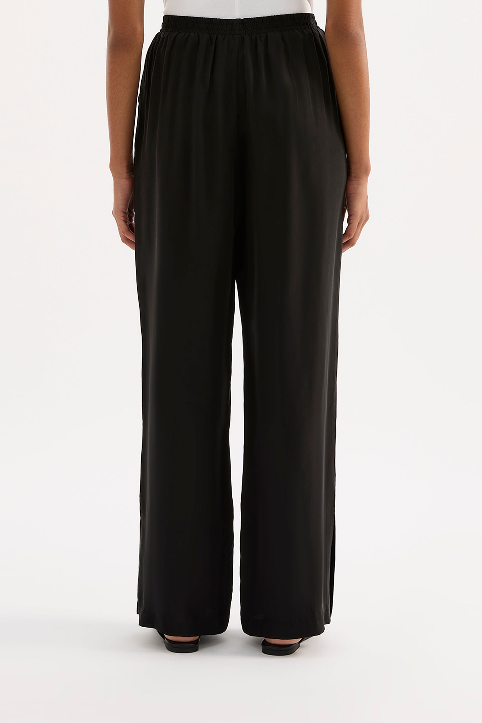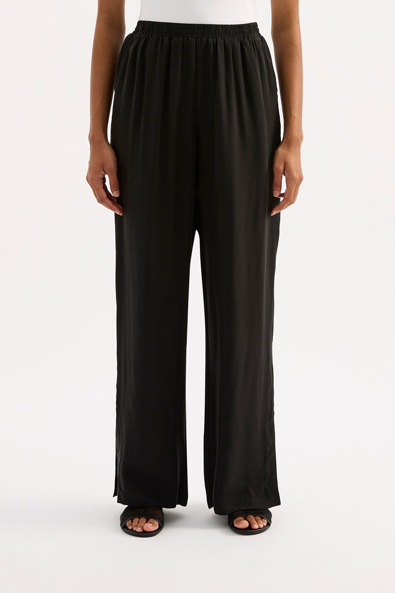 The Dara Cupro Pant in pickle is made in our signature cupro fabrication which has a soft, sueded hand feel. The silhouette is a relaxed wide leg, full length pant. Features include an elasticated waistband, side seam pockets and slits at hem.