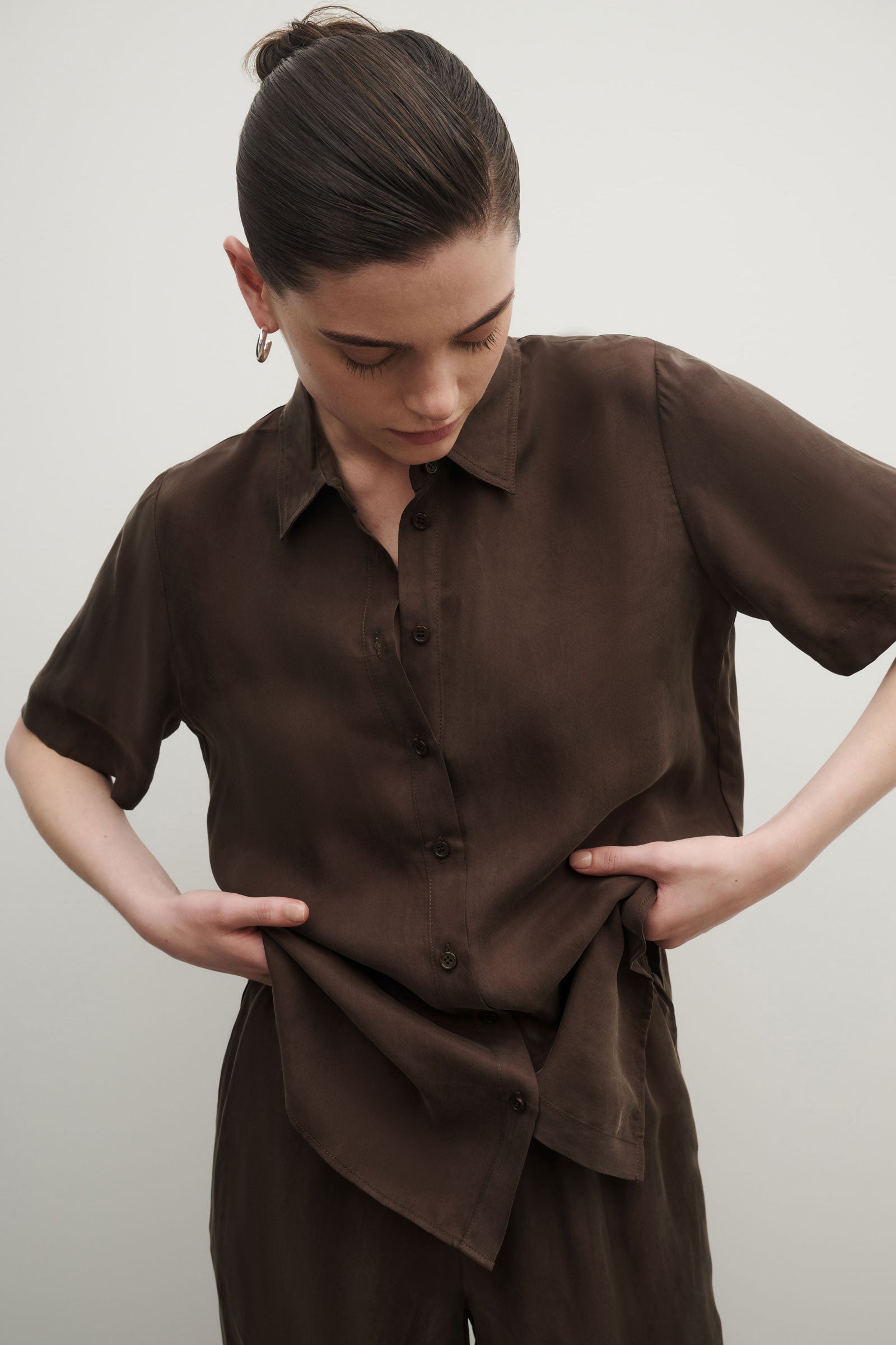 The Dara Cupro Shirt is made in our signature cupro with a soft, sueded hand feel. The silhouette is relaxed and oversized through the body with the length finishing below the hips. Features include classic shirt detailing with back yoke and front button opening.