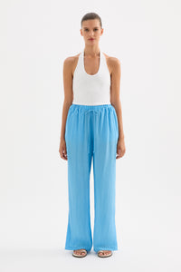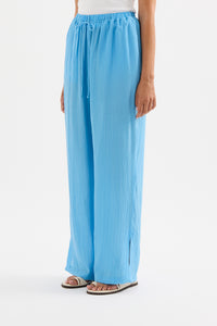The Demi Pant is made from a viscose blend fabric which is lightweight and has a soft, textured hand feel. The silhouette is a relaxed wide leg, full length pant. Features include an elasticated waistband, side seam pockets and slits at hem.
