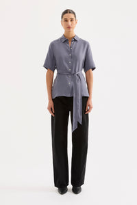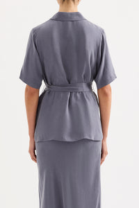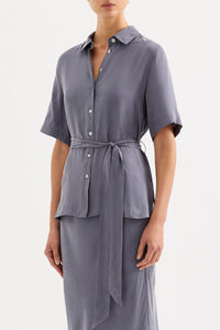 The Devin Tencel Shirt is made from a Tencel blend fabrication with a soft, sueded hand feel. The silhouette is an relaxed fit, with length finishing at the hip. Features include classic shirting details, shell buttons and a soft waist tie.