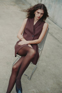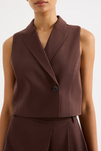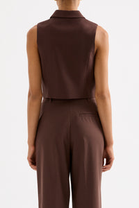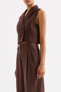 The Easton Vest is made from a classic wool blend suiting fabrication with a smooth hand feel. The silhouette is tailored and cropped with length finishing at the waist. Features include traditional tailoring features including collar and lapel, shaped panel lines and nude lucy branded button. This style is fully lined.
