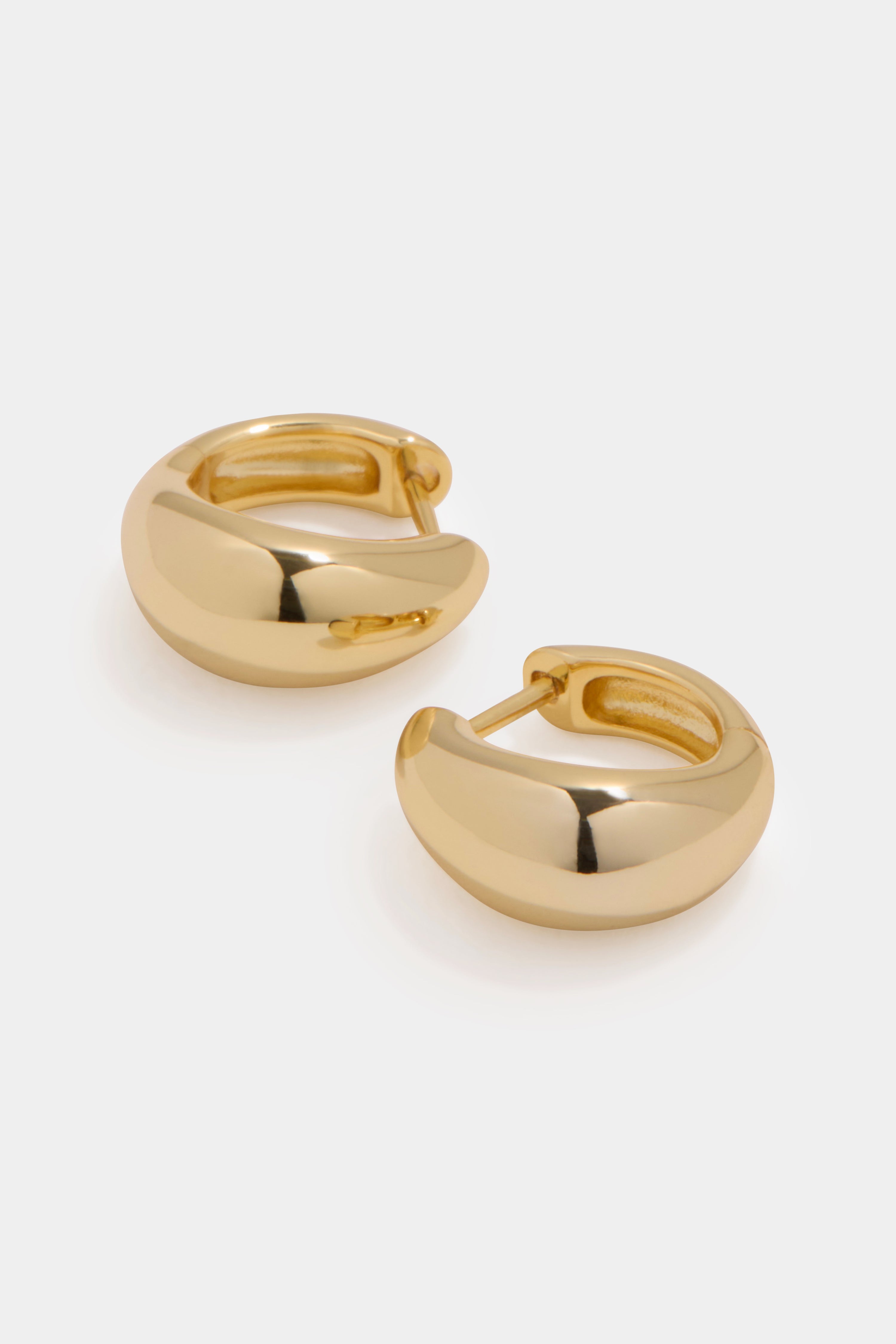 The Elio Huggies is crafted from 18 karat gold plating and is designed in a round sculptural silhouette. These huggies have a polished, smooth finish and feature a click through fastening for easy closure.