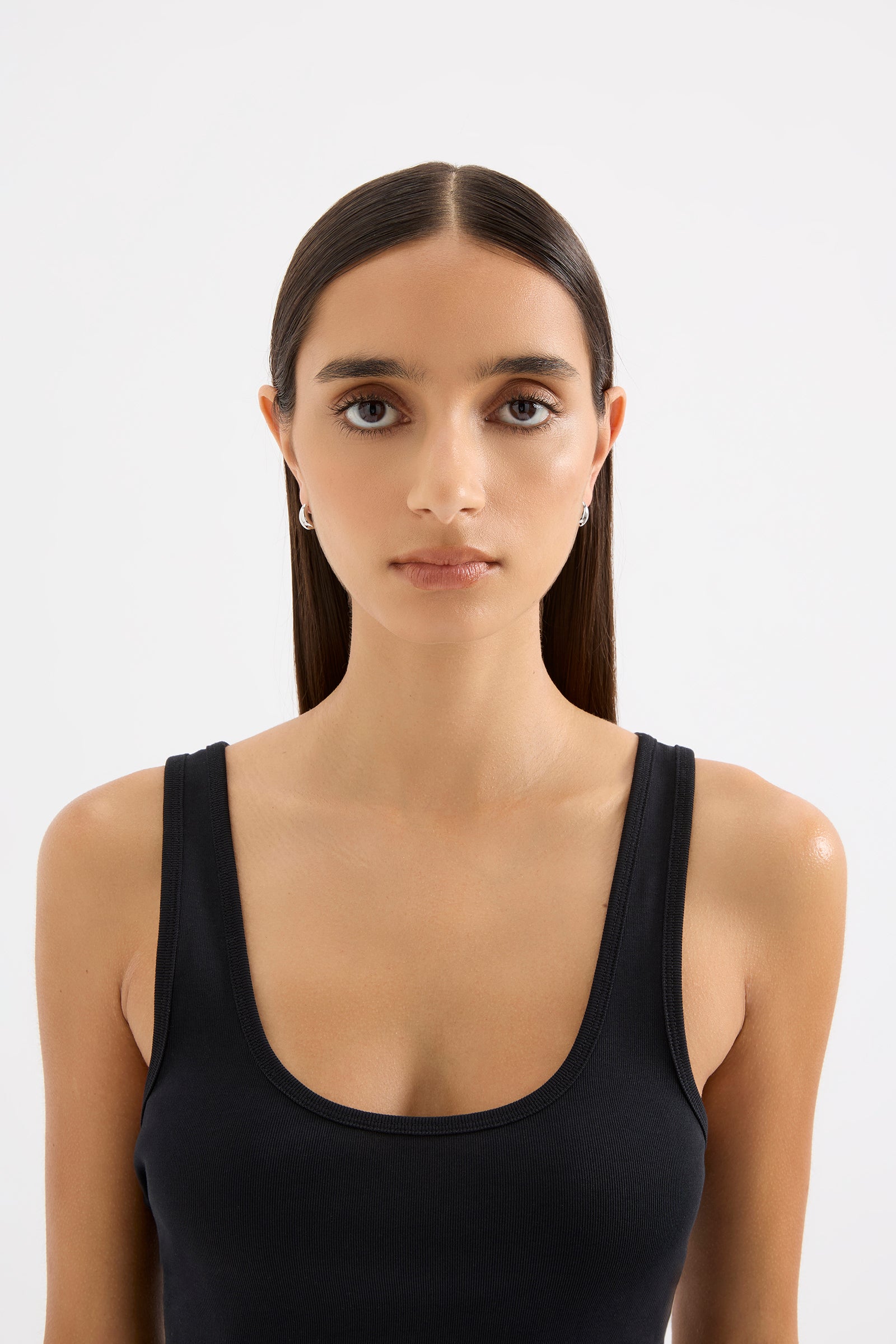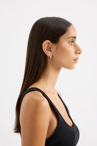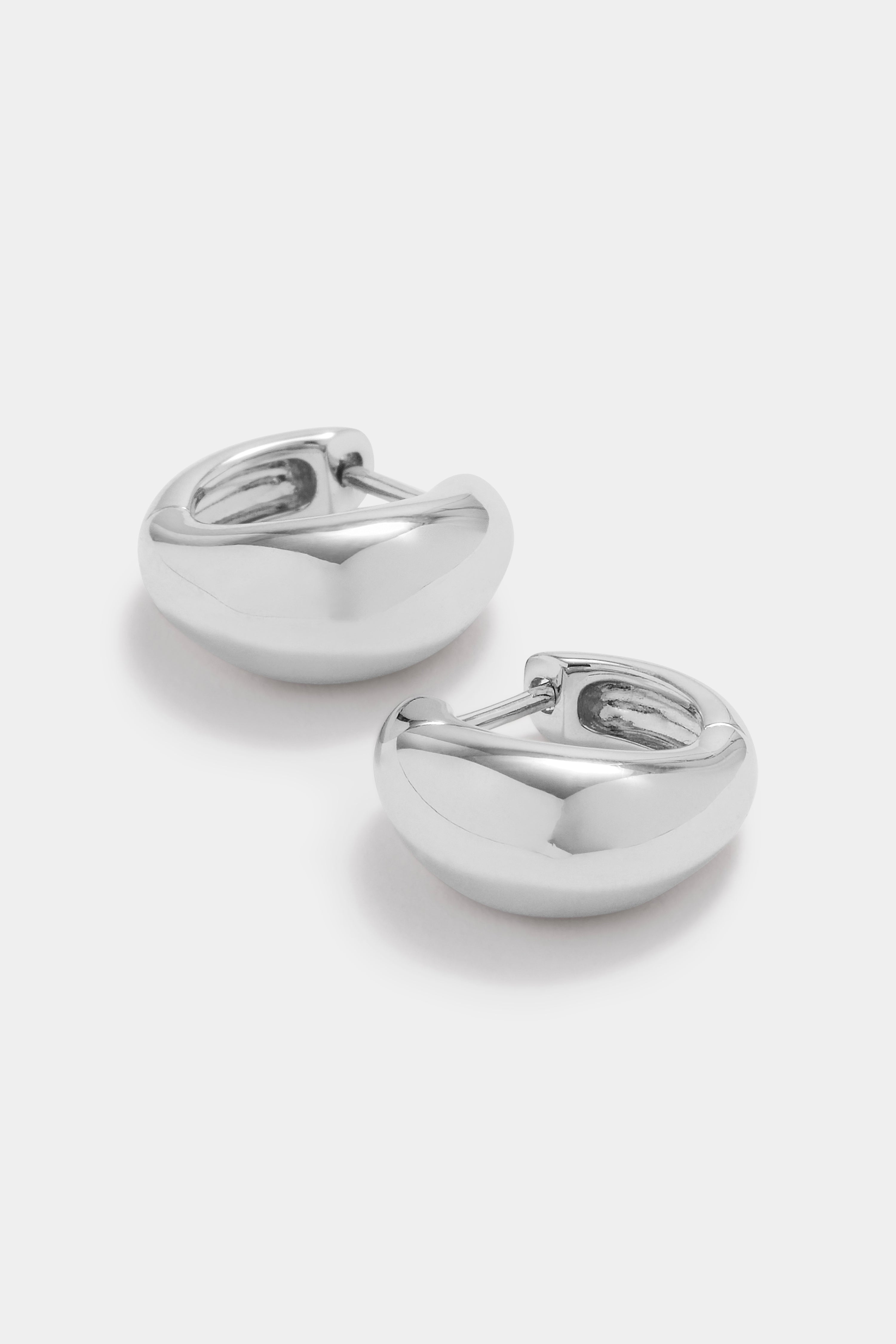 The Elio Huggies is crafted from rhodium plating and is designed in a round sculptural silhouette. These huggies have a polished, smooth finish and feature a click through fastening for easy closure.