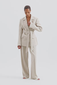 The Eryn Blazer is made from a classic suiting fabrication with a smooth hand feel. The silhouette is a structured double breasted shape with classic sloped shoulder, relaxed to slim fit body & full length sleeve. Features include traditional tailoring detailing throughout, tailored vents at sleeves and back of body, Nude Lucy branded buttons and tie at waist.