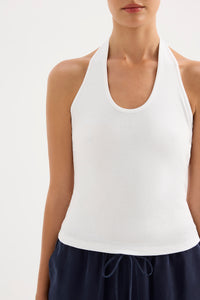 The Gaia Tank is made from a lightweight organic cotton jersey, which has a soft, breathable hand feel. The silhouette is a classic slim fitting tank finishing on the hips. Features include a thick halter neck and low scoop neckline.