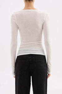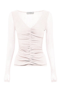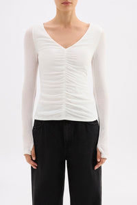 The Gigi Mesh Top is made from a stretch jersey fabrication that has a dry, lightweight hand feel. This long sleeve top has a figure hugging silhouette. Features include V neckline, soft gathers through centre of body and thumb holes. This top is lined through body.