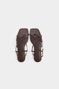 The Hana Croc Sandal is made from a premium leather upper that has a textured, croc finish. Features include an straps that cross across the foot and a sling back with small elastic.