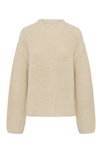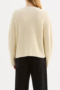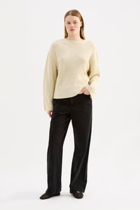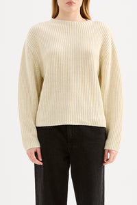 The Hana Knit is made from a midweight, cotton blend yarn with a soft and smooth hand feel. The silhouette is relaxed with a high neck and length finishing at the hips. Features include two-tone yarn and rib knit construction.