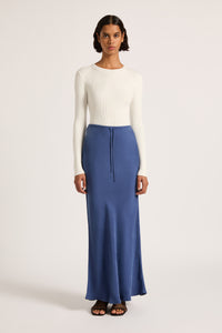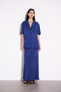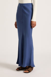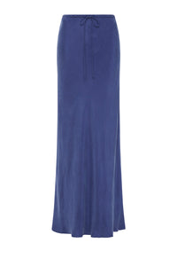 The Hayz Cupro Maxi Skirt in indigo is made in our signature cupro fabrication which has a soft, sueded hand feel. Cut on the bias, this silhouette finishes just above the ankles. Features include encased elasticated waistband with a self cut draw string at centre front.