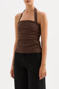 The Hermione Mesh Top is made from a stretch jersey with a dry hand feel. The silhouette is a form fitting top with a halter neck. Features include a square neckline with soft gathering through the body. This top is fully lined.