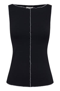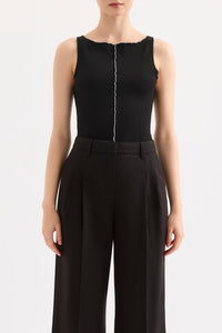 The Hilda Tank is made from a lightweight textured jersey that is stretchy and soft on the skin. The silhouette is slim fitting with a boat neck and length sitting at hip level. Features include contrasting baby locked edges.