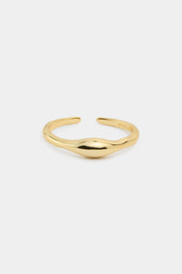 The Ivy Ring is crafted with 18 karat gold plating and features a thin silhouette with wave detailing. This solid shaped ring is adjustable and has a polished, smooth finished.