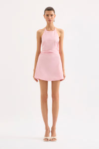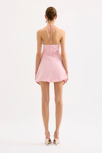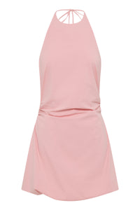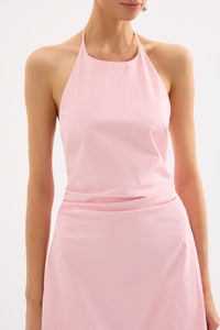 The Jamila Mini Dress is made from a premium cotton blend with a dry, textured hand feel. The silhouette has a high neckline with halter ties. This style has soft gathering through the waist and a centre back seam with a slight bubble hem.