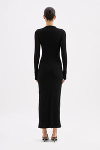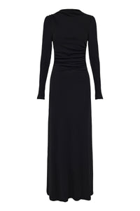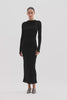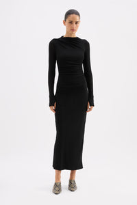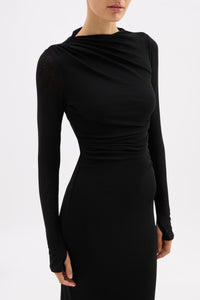 The Juniper Mesh Dress is made from a stretch jersey fabrication that has a dry, lightweight hand feel. The silhouette is figure hugging and maxi length. It features a raised neckline, straight skirt, long sleeves, draping through waist and across chest and thumb holes. This dress is lined through body.