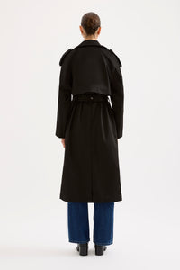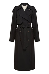 The Kaiya Trench is made from a heavyweight cotton fabric which has a twill finish. The silhouette is relaxed with wide, full length sleeve and body length finishing below the knees. Classic trench coat features, including storm flap, waist tie and welt pocket pockets.
